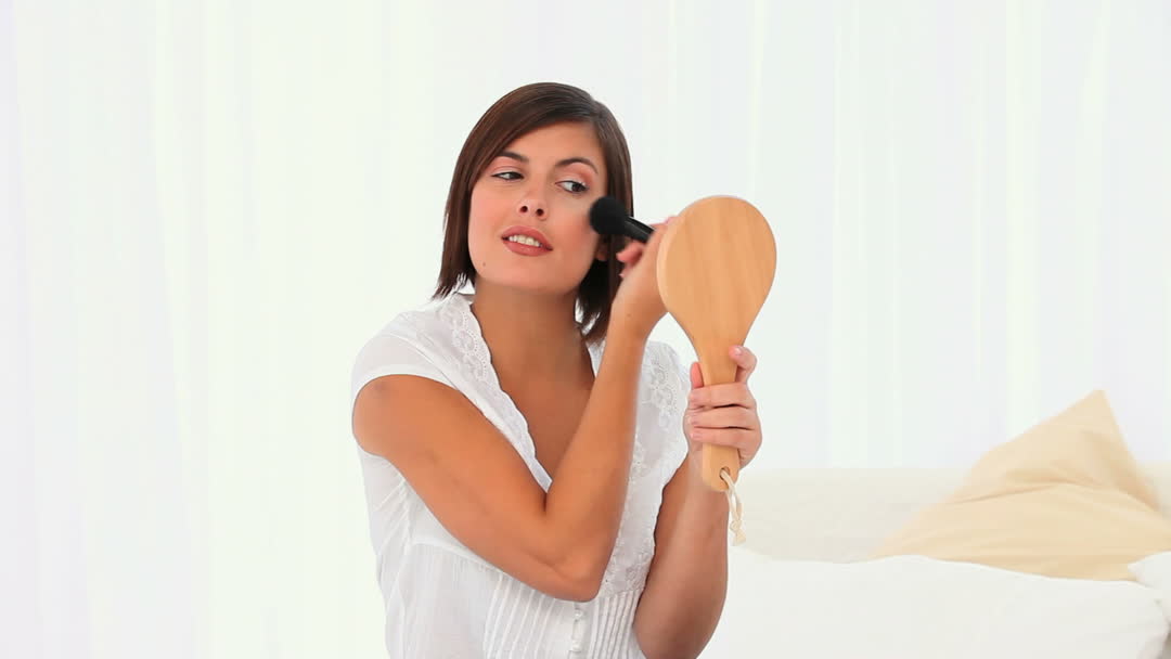 - Woman Applying Makeup Using Handheld Mirror
