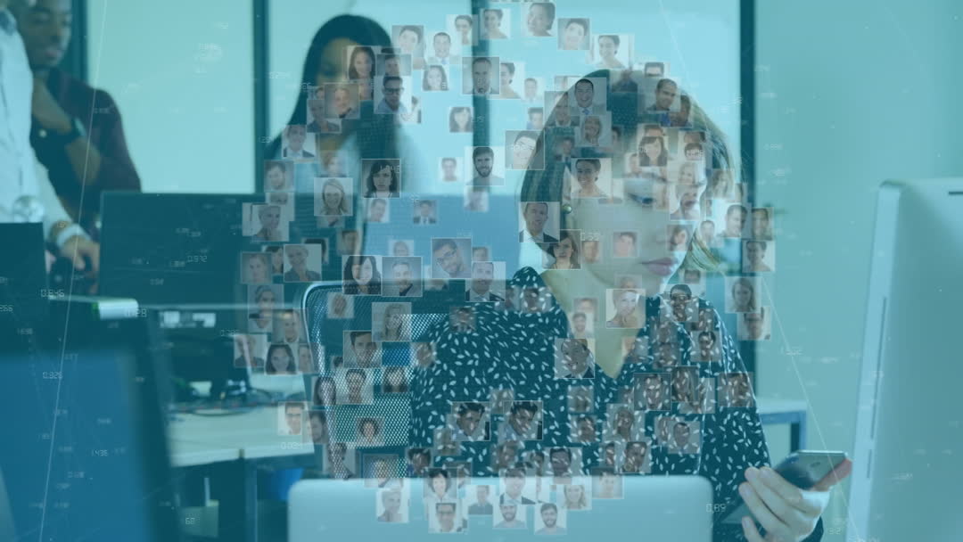 A woman in an office is using her smartphone while overlaid digital videos of profile icons represent global networking technology. Ideal for illustrating concepts of digital communication, technology integration in business, or online networking in a modern workplace environment.