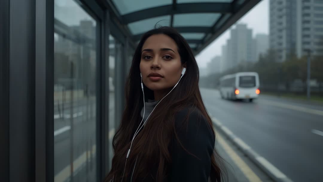 - Woman at Urban Bus Stop Listening to Music on Rainy Day