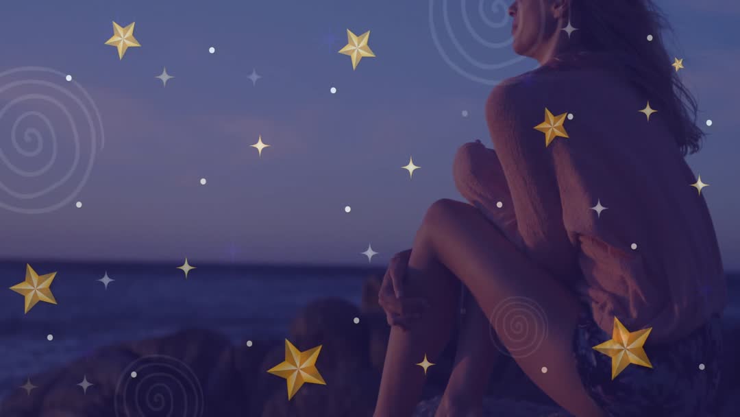 Captures woman sitting peacefully by ocean with whimsical star and swirl animations. Creates a fantasy-inspired, magical atmosphere. Perfect for use in themes of serenity, dreams, imagination, storybook covers, or multimedia projects emphasizing tranquility and creativity.