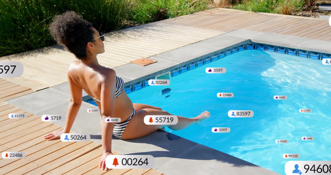 A biracial woman in swimwear enjoying a sunny day by a luxurious pool, while various social media notification bubbles float around her. This concept piece visually represents the constant presence of social media in everyday life, even during moments of leisure. Suitable for themes related to digital life, mobile technology, vacation marketing, or wellness articles discussing tech-free distancing.