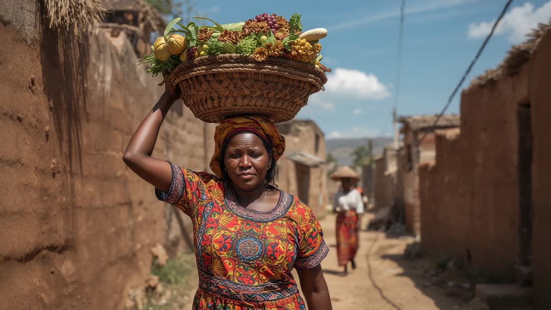 AI Generated Video. Woman carrying woven basket of fresh fruit and vegetables on head while walking down sunlit mudbrick alley in rural village. Clothing featuring colorful patterned dress and matching headscarf, steadying basket with one hand, background showing another local vendor and narrow lane. Warm midday light and shallow depth of field creating intimate, documentary mood and strong vertical composition. Useful for travel features, cultural stories, lifestyle articles, market economy reports, women entrepreneur profiles, tourism promotion, and food supply chain narratives. Working well as archival stock footage, website hero banner, social media campaign, print editorial spread, or documentary sequence highlighting traditional trade and daily life.