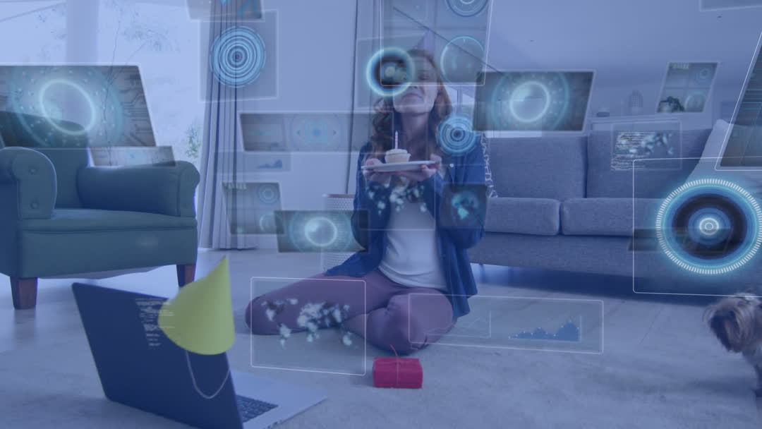 - Woman Celebrating Virtual Birthday with Data Interface Elements
