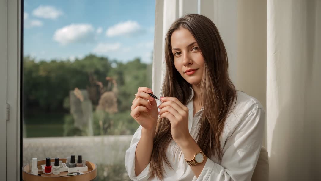 AI Generated Image. Video showing young woman checking nail polish brush at window, preparing manicure with assortment of lacquer bottles on wooden tray. Soft natural light and neutral curtains creating calm, cozy mood with minimalist styling. Perfect for beauty tutorials, salon promotion, nail polish product ads, self-care and wellness content, lifestyle vlogs, social media reels. Useful for step-by-step manicure guides, before-and-after sequences, e-commerce product pages, banner headers, advertising for at-home nail kits and spa services. Frame allowing easy cropping to vertical formats for reels and stories, close-up insert clips for transitions and overlays, voiceover and text captioning.