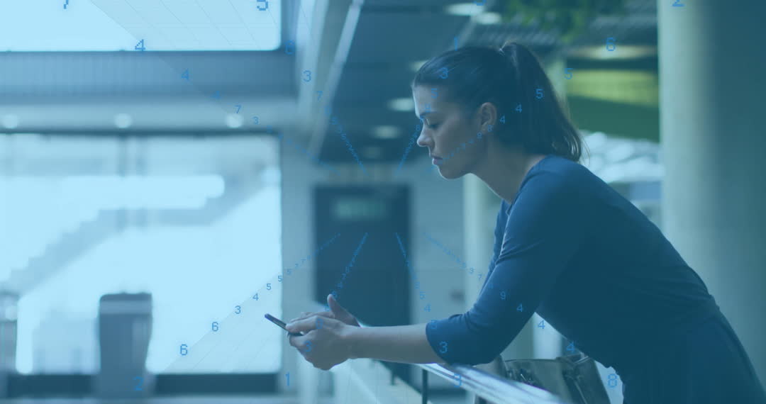 Woman is leaning on a railing, focusing on her smartphone, with an animated numeric pattern overlay on the background. This background suggests digital or technological themes. This visual can be used to illustrate modern communication habits, emerging technology trends, and concepts of connectivity. It would be suitable for use in articles or pieces discussing mobile technology’s role in daily life, or presentations on digital innovations.