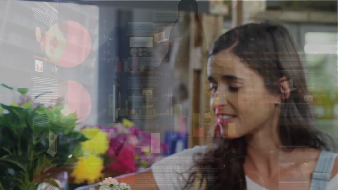 Woman Choosing Colorful Bouquet with Financial Graph Overlays Video