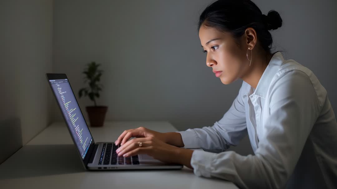 - Woman Concentrating on Laptop Code in Minimalist Workspace