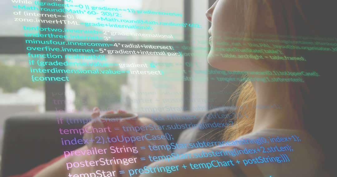 A woman cradles a mug while viewing lines of code overlaying her view from a window. This visual captures contemplation amid digital advancement and innovative thinking. Perfect for representing modern technology, program development, digital workspaces, as well as themes of future thinking and self-reflection in tech-savvy environments.