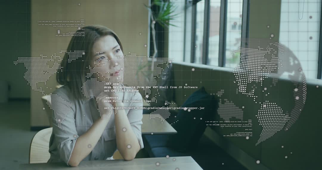Video captures woman resting her chin while a digital world map with data overlays appear around her. This symbolizes advanced technology, innovation in business, and digital transformation. Useful for advertisements or presentations focusing on tech startups, data-driven solutions, or future work environments. Perfect for illustrating themes of cutting-edge workplace technology and modern analytical approaches.
