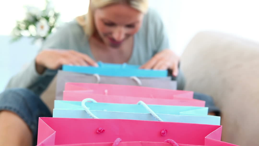 Woman Curiously Inspecting Multiple Colorful Shopping Bags at Home Video