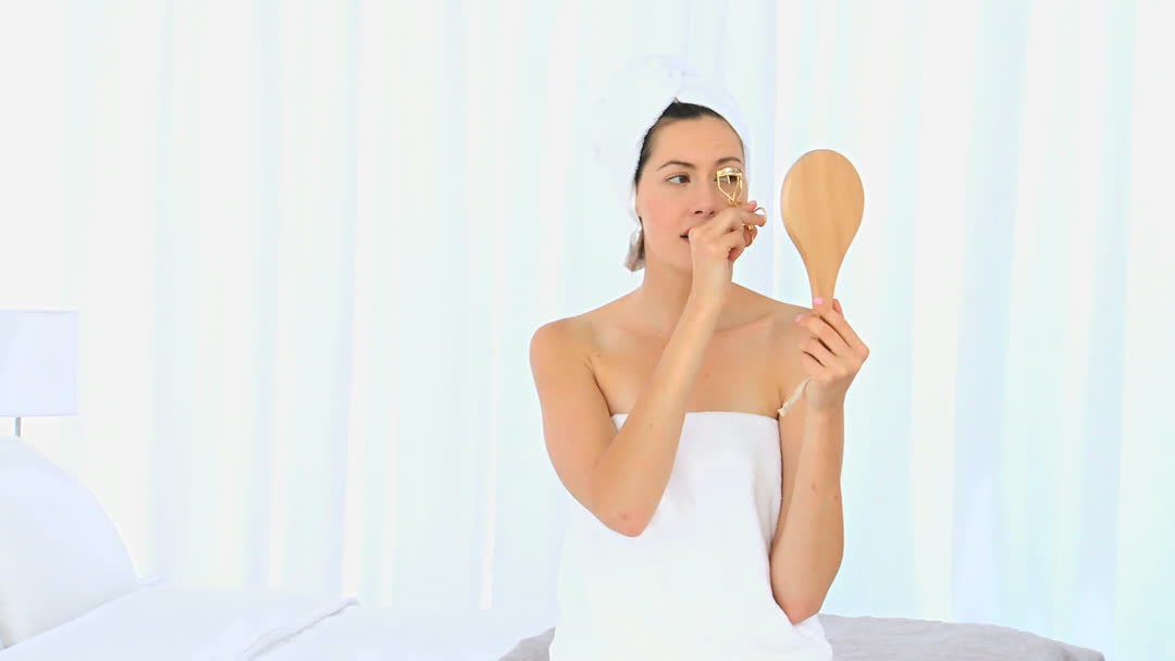 A woman dressed in a white towel and towel wrapped around her hair curls her eyelashes using a handheld mirror in a bright room. This scene conveys themes of personal beauty and daily beauty routines, ideal for articles about skincare, self-care, or creating beauty tutorials.