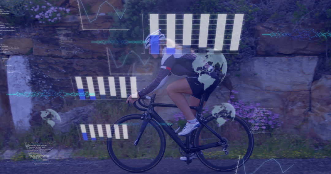 A woman is cycling on a road with a modern digital interface overlay depicting data processing elements like graphs and globes, conveying advanced technology and connectivity. This is ideal for visuals depicting fitness technology, global sports networks, or futuristic health monitoring tools.
