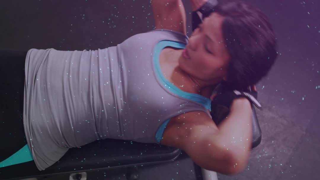 Video clip showing woman doing bench crunches while wearing workout gloves and tank top. Overhead angle focusing on torso and abs, spark overlay tracking movement across frame. Motion blur on head suggesting vigorous repetition and steady breathing. Useful for fitness tutorial clips, core training demonstrations, gym marketing, social media workout reels, mobile app exercise guides, and online fitness course promos. Suitable for headlines about core strength, beginner abs program, home gym routine, women's fitness, and strength training. Color palette leaning toward cool tones with soft studio lighting. Crop-safe for vertical short-form video and loopable for repeating crunch motion.