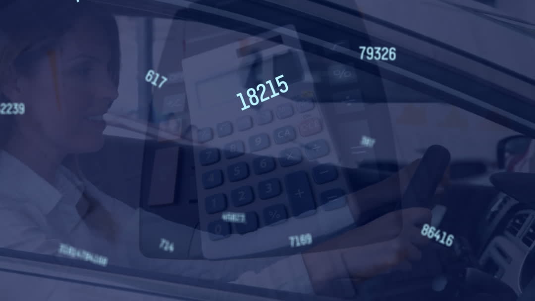 Woman Driving Car with Superimposed Financial Data and Calculator Video