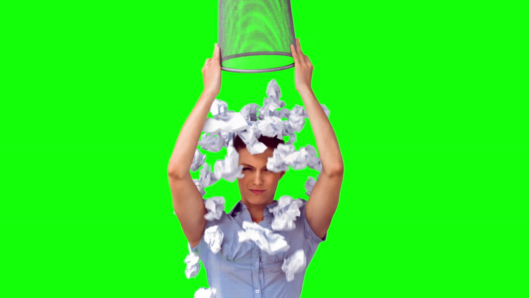 Brunette woman drops crumpled papers dramatically from an overturned wastebasket, standing against a vibrant green backdrop. This visual facilitates discussions about recycling, waste management, and creative use of space for advertising bold ideas in ecology or productivity campaigns.
