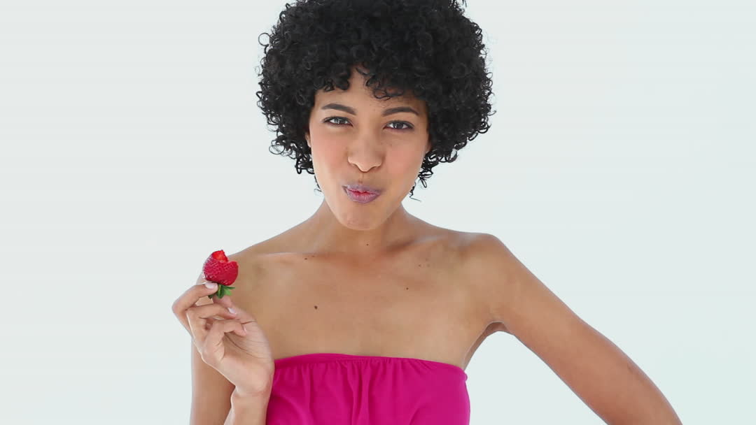 Woman with curly hair enjoys a strawberry against a white background, exuding a cheerful and playful vibe. Ideal for promoting healthy eating, summer themes, or lifestyle content. Perfect for social media, food blogs, or marketing materials highlighting fresh produce and healthy living.