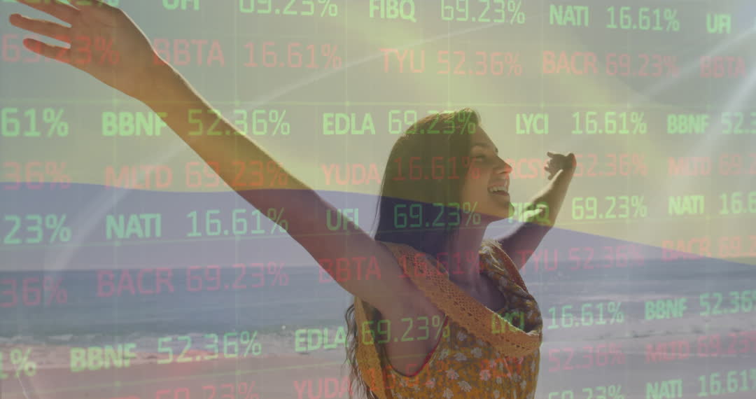 An video depicting a woman on the beach with her arms raised in excitement, overlaid by digital stock market graphics showing different values. Useful for themes related to finance, success, lifestyle, vacations, or digital technology merging with outdoor activities. Ideal for articles discussing financial growth, the stock market, or the enjoyment of financial independence.