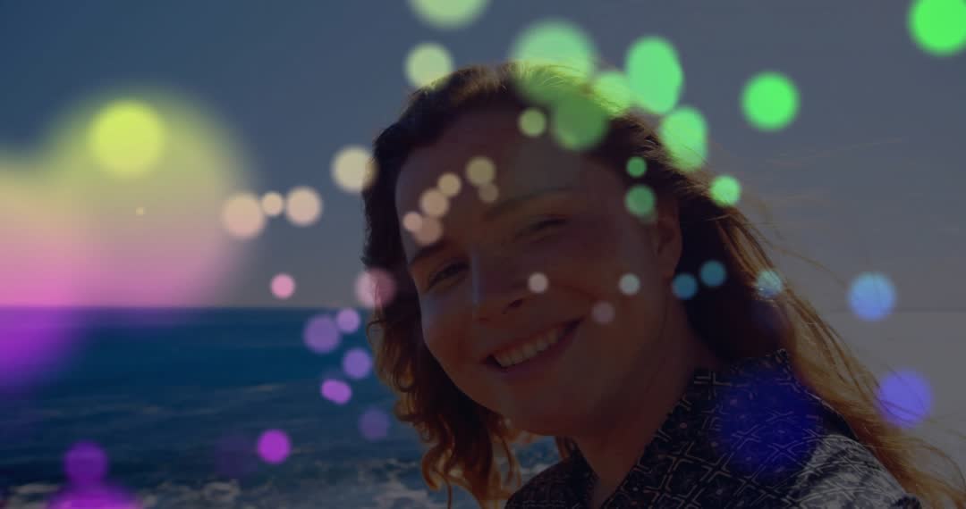 A woman is pictured by the ocean, closing her eyes with a gentle smile as colorful bokeh light blurs create a sense of tranquility and harmony. This stock video exudes calmness and wellness, perfectly suited for ads on mindfulness, meditation, nature retreats, and stress relief. Ideal for promoting services related to mental health, relaxation, and well-being.