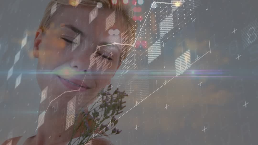 This video features a woman peacefully holding a sprig, with dynamic graphs representing business data growth overlaid. It creatively blends themes of innovation, technology, and wellness to suggest sustainable development. Use this for presentations on future technology, business scenarios showcasing innovative growth, or wellness integrated with modern business practices.