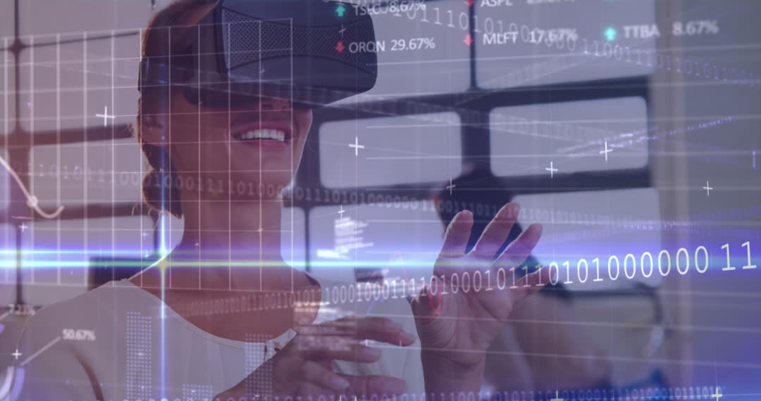 A woman wearing a virtual reality headset interacts with digital binary codes in a modern high-tech environment. Suitable for use in promotional materials highlighting advancements in VR technology, immersive digital experiences, and innovative solutions in IT and computing sectors.
