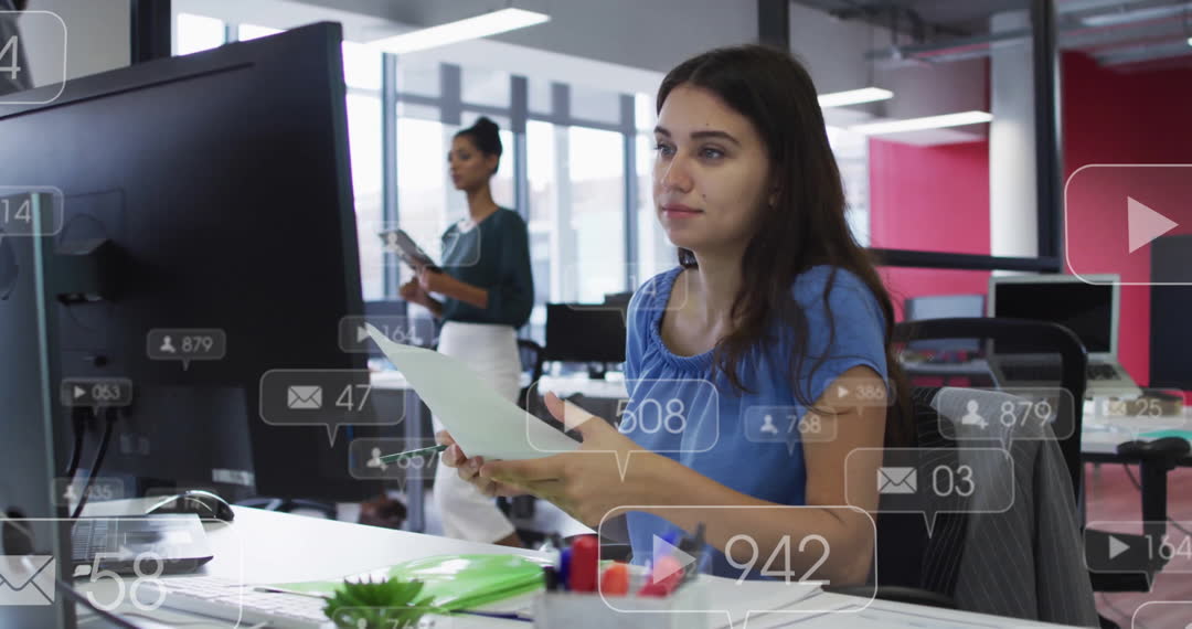 Caucasian woman preparing documents at her desk surrounded by digital notification icons in modern office setting. Notifications show emails, likes, messages highlighting productivity and connectivity. Ideal for illustrating business growth, technology integration, and the impact of social media on work.