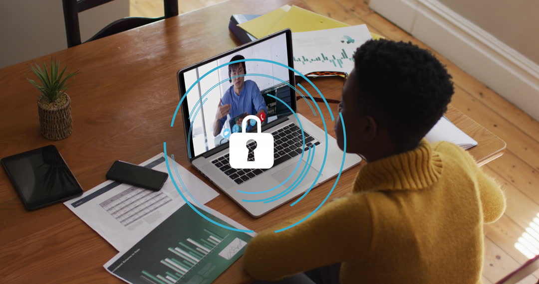 Image shows a woman in a home office setting participating in a video call on her laptop. The digital padlock graphic symbolizes security, emphasizing data protection and safe communication. Useful for themes on secure remote working environments, cybersecurity in virtual meetings, or the impact of technology on modern work habits.