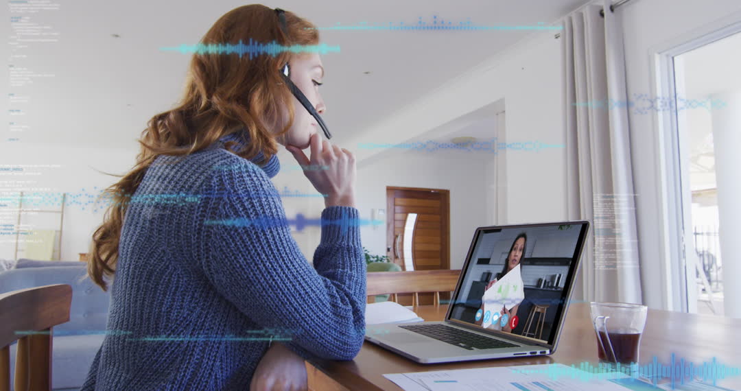 Caucasian woman participates in a virtual meeting using a laptop while working from home. Data overlay graphics suggest active information exchange, ideal for illustrating remote work, digital communication, or tech-forward teamwork. Suitable for articles on home-based work dynamics, technology in communication, or corporate training materials.