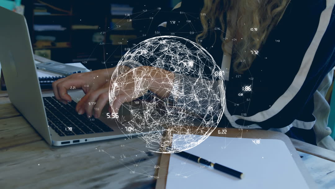 Scene depicting woman in office working on laptop with an animated globe representing global networking overlayed. Ideal for illustrating concepts of digital communication, technology in business, and global connectivity in digital marketing, tech blogs, or innovation-driven industries.
