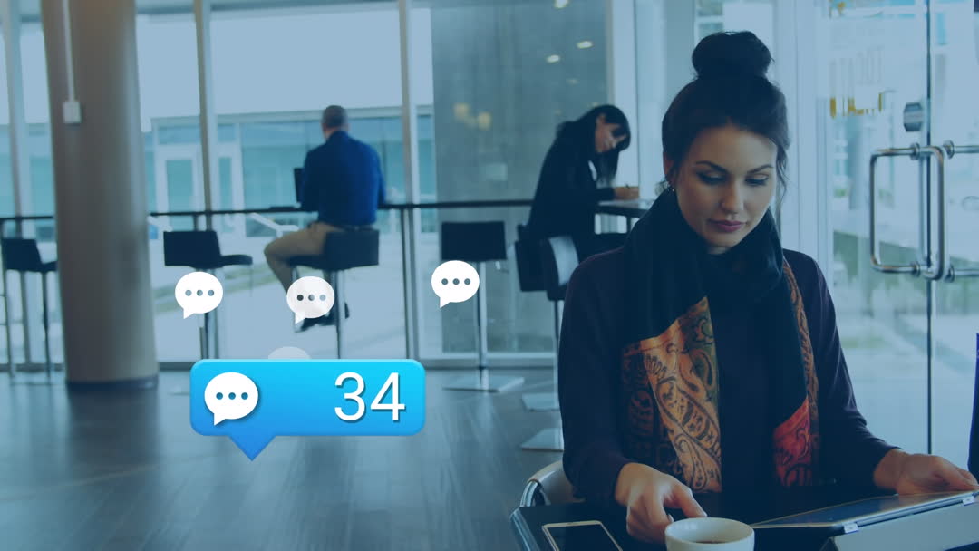 Woman at desk with tablet using digital communication in a modern office environment. Ideal for illustrating digital workspaces, business communication, or dynamic network interactions in professional settings.