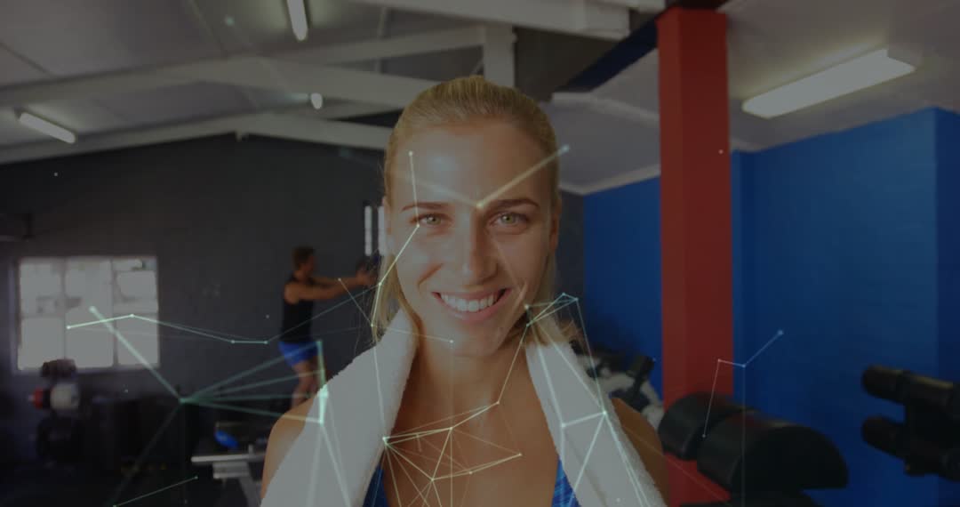 Image showcases a woman in a gym environment actively engaging with fitness technology using augmented reality nodes. Her interaction symbolizes an innovative approach to health and exercise incorporating digital and real-world elements. Utilizable for promoting modern fitness training programs, or showcasing advancements in AR applications in sports settings.