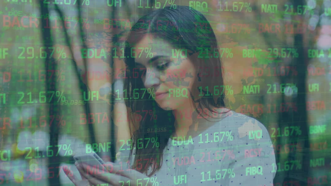 A woman is seen using her mobile phone to send messages, with a dynamic digital interface overlay in the foreground illustrating stock data and connectivity. This visual represents the modern intertwining of daily life with technology, making it ideal for themes of communication, technology innovation, and digital lifestyles in articles, marketing materials, or websites.