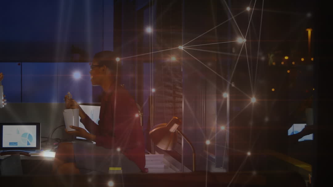 Silhouette of woman exercising outdoors at night, surrounded by a digitally-illustrated network of glowing connections. This element emphasizes technological integration and connectivity in modern fitness routines. Use to illustrate advancements in health technology, trends in outdoor fitness, innovation in exercise routines, or conceptual graphics about connection and progress.