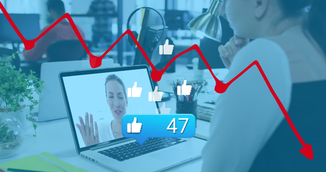 A woman participates in a video call on her laptop, featuring floating social media likes and transparent graphs overlaying the scene. This combination of action and graphic elements suggests themes of business communication, modern technology, and social media analytics. Perfect for illustrating articles or marketing materials relating to online interactions, digital marketing strategies, or remote business operations.