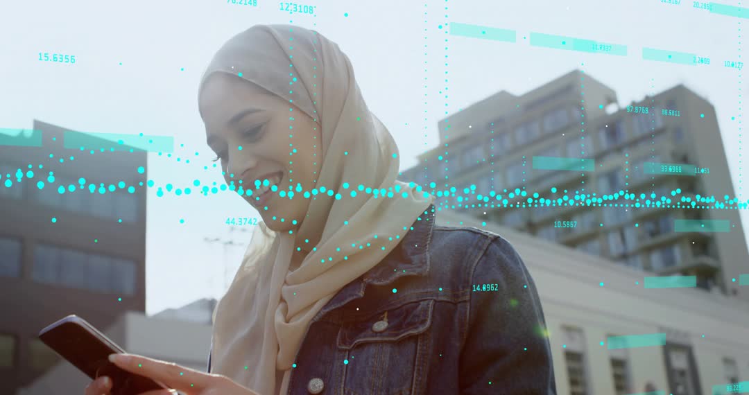Arab woman wearing hijab checking notifications on smartphone with dynamic data visualizations in backdrop indicates technological engagement in modern environment. Ideal for themes on technology connectivity, data analytics, mobile apps transforming urban communication landscape.