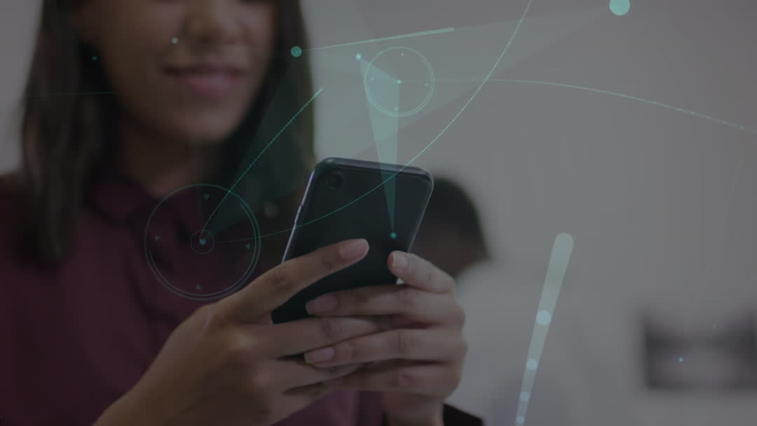 Visual showcases a biracial woman holding a smartphone, with animated digital networks overlaying, representing modern communication and technology. Ideal for illustrating themes of connectivity, innovation in tech marketing, digital communications campaigns, and solutions in tech services.