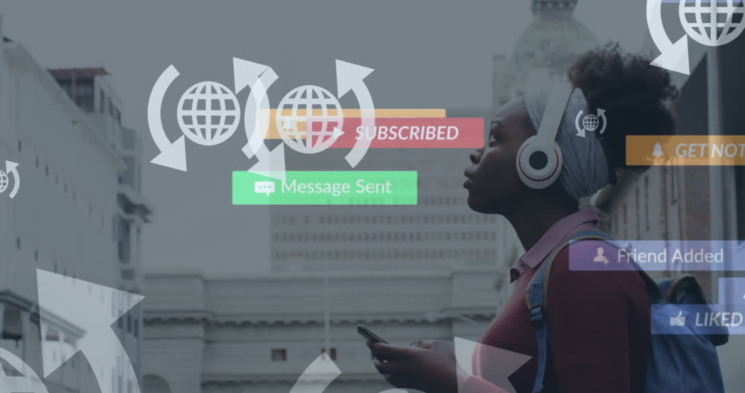 Image depicts woman wearing headphones while looking at smartphone, surrounded by digital notifications and network icons. Symbolizes connectivity and engagement in digital social networks in urban environment. Useful for illustrating technology use, social media interaction, and the concept of global digital communication.
