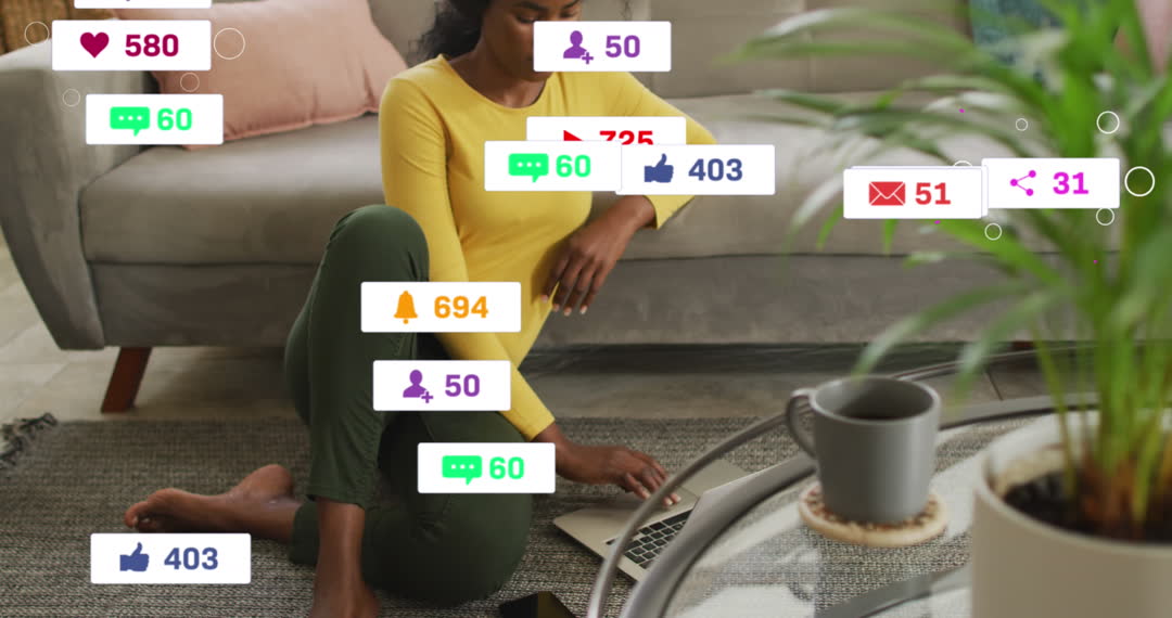 Depicting a woman sitting comfortably on the floor with notifications from social media platforms surrounding her, this concept highlights the instant connectivity and engagement in today's digital world. Perfect for illustrating themes related to social media use, digital communication, and technology habits. Suitable for articles, presentations, or content focusing on modern lifestyle and online interaction.