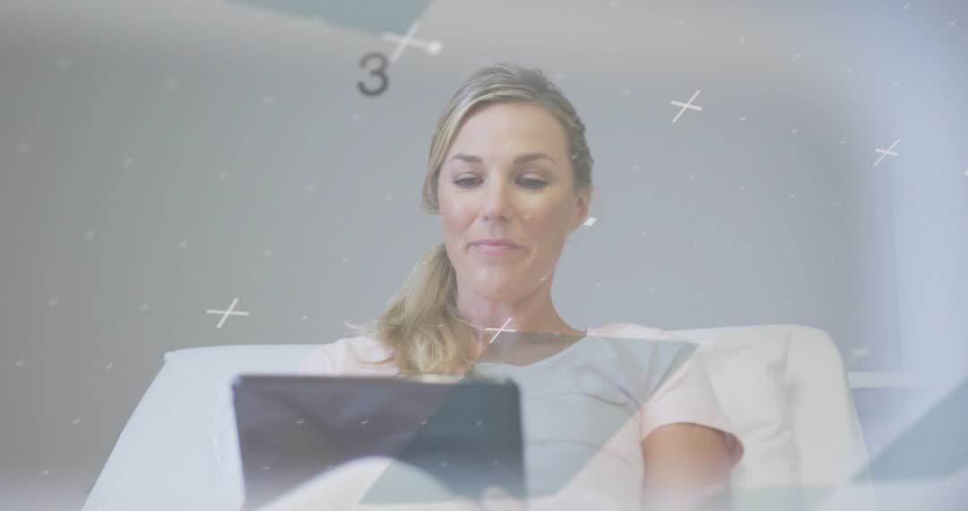 A woman seated indoors interacts purposefully with a tablet device. Surrounded by digital symbols, this scene conveys themes of technology, innovation, and contemplation. Ideal for content focusing on modern digital interactions, tech solutions, or user engagement.