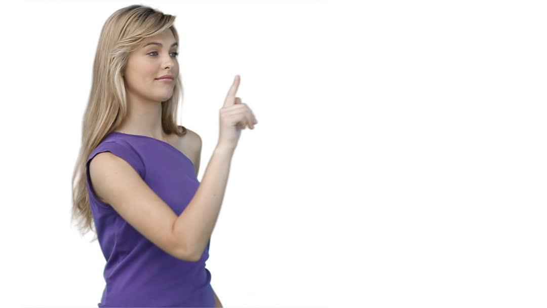 Woman interacting with invisible digital interface, showcasing concept of futuristic and interactive technology. Perfect for technology presentations, digital innovation themes, or showcasing virtual reality concepts in professional settings.