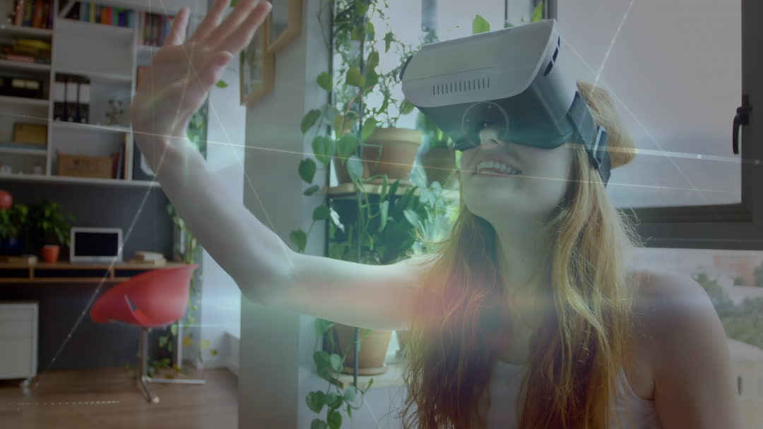 An animated overlay depicts connections while a woman interacts with virtual reality, illustrating modern technology mixed with home aesthetics. Useful for depicting technology usage, digital advancements, and immersive media experiences.