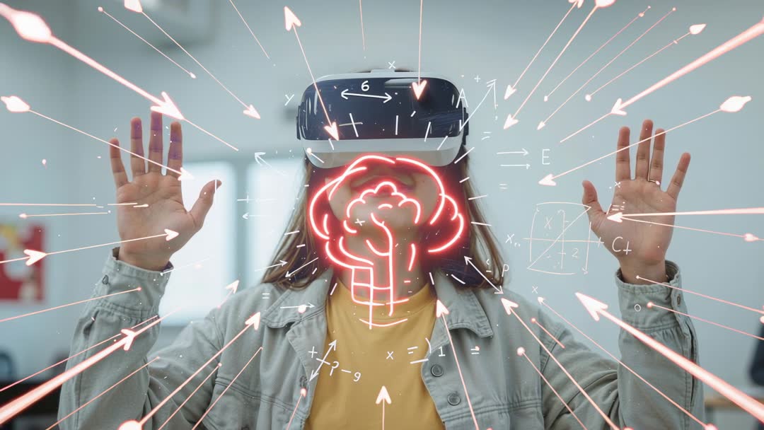 AI Generated Image. A woman is immersed in a virtual reality experience, evidenced by a VR headset and an illuminated brain graphic accompanying mathematical annotations. Use this video to represent advanced educational methods, innovations in virtual reality, or explore the intersection of digital interfaces and neuroscience. Ideal for publishing articles on technology, futuristic education tools, or showcases on science-related innovations.