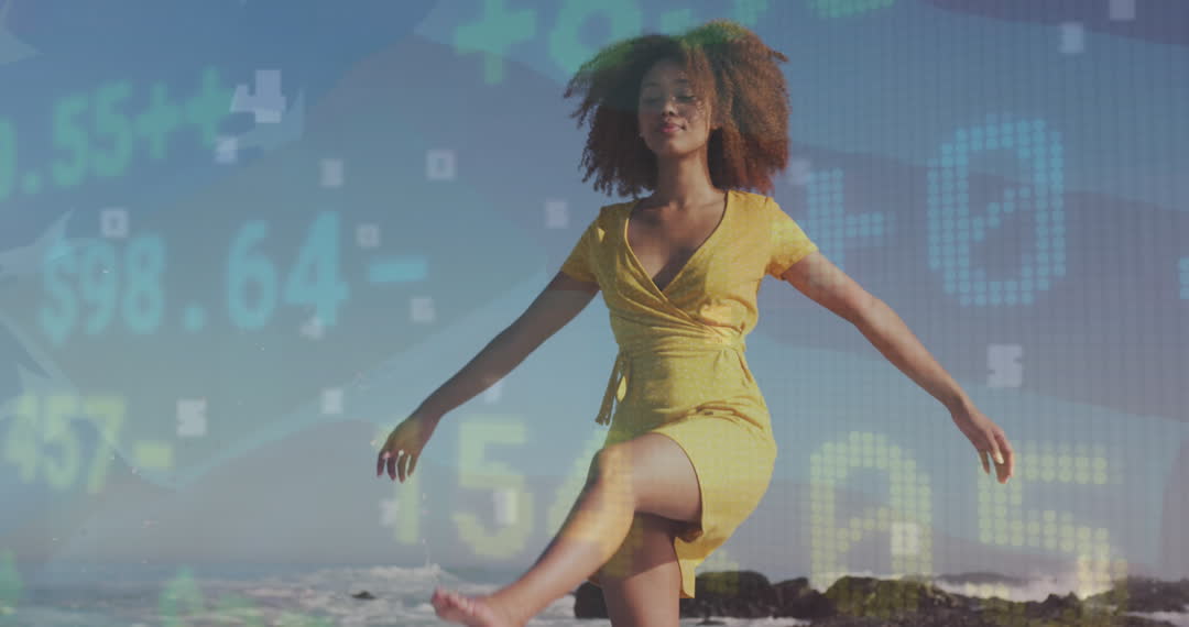 A woman in a yellow dress is on a beach with a digital overlay of stock market data, symbolizing a mix of leisure and finance. Suitable for themes around balancing life and investments, depicting freedom in financial decisions, or creative representation of market dynamics.