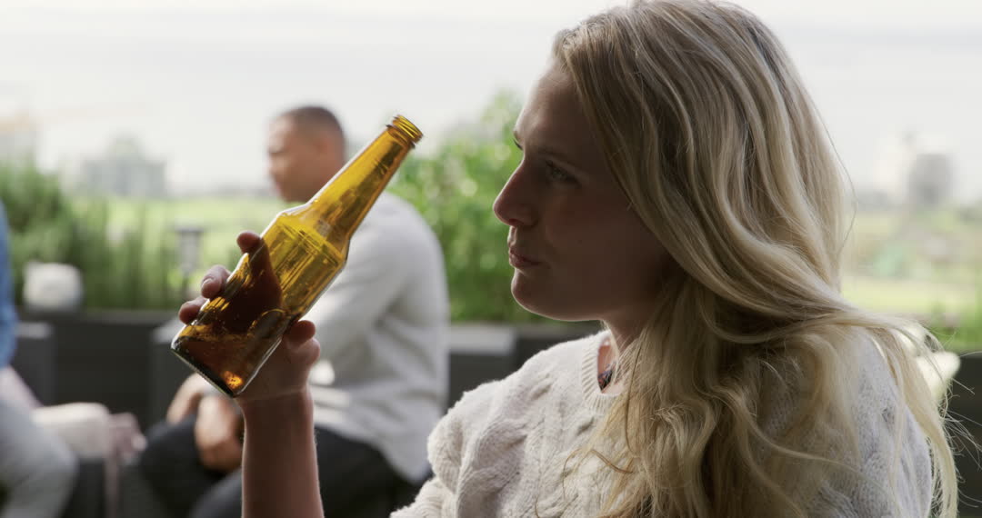 - Woman Enjoying Beer on Rooftop Terrace with Friends