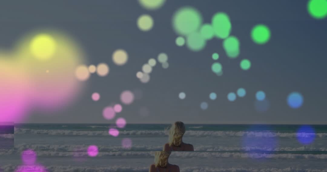 This serene depiction showcases a woman standing calmly near the ocean waves, engulfed in a surrounding atmosphere filled with pastel bokeh lights, creating a dreamy and ethereal ambiance. Ideal for illustrating themes of relaxation, peace, or tranquility, making it perfect for designing promotional materials for wellness, meditation or spa services. The video could be thoughtfully utilized in branding efforts or print media to convey a sense of calm through nature blended with abstract design.