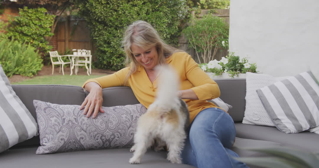 Middle-aged woman relaxing on outdoor sofa in vibrant, green garden, displaying joy and companionship with playful pet dog jumping up. Suitable for themes on leisure, pet companionship, outdoor living, backyard scenes. Ideal for lifestyle, gardening or pet-related promotions.