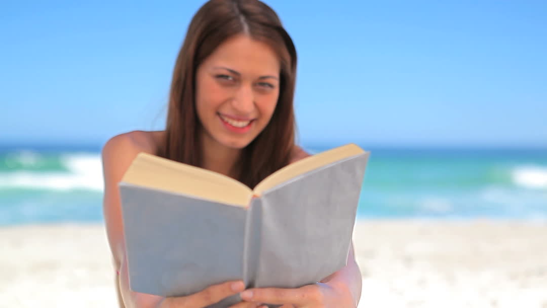 - Woman Enjoying Summer Beach Day with Book and Ocean View