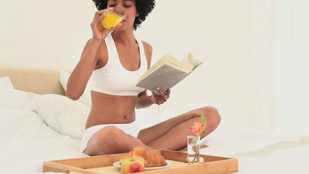 - Woman Enjoys Breakfast in Bed While Reading a Book