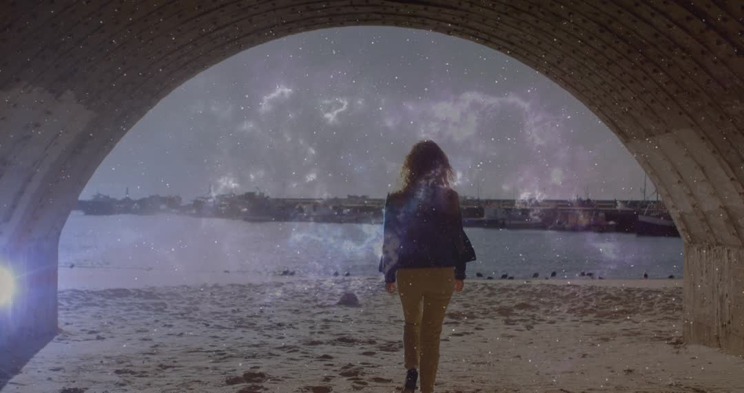 This video captures a woman walking through a brick arch onto a beach with a futuristic cosmic overlay, symbolizing exploration and journeys. The serene setting combined with the surreal, starry effects creates a sense of wonder and adventure. Ideal for use in technology or science fiction themes, promoting travel and exploration, or illustrating concepts of innovation and futuristic advancements.