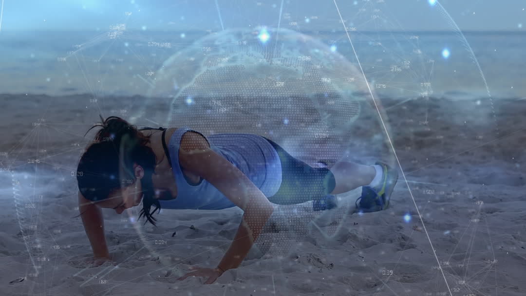 Woman Exercising with Digital Globe Overlay on Beach Video
