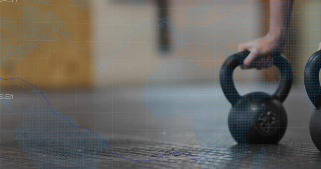 A woman works out using a kettlebell, complemented by overlaid digital data representing fitness tracking. Ideal for illustrating the intersection of fitness and technology, suitable for promoting workout apps, fitness tracking devices, or health tech innovation on digital platforms.